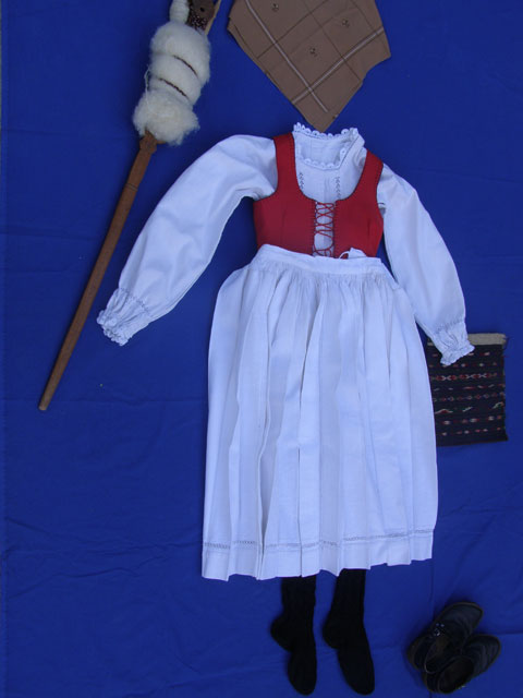 Ženska nošnja: košuljica, potkošulja, košulja i zaslon, na nogama crne vunene čarape i opanci. Ova nošnja za svečane prigode obogaćena je štofanim prslucima (crvene, zelene, plave boje) i štoganim maramama. Za svečane prilike starije žene nose satkane ili spletene torbice.